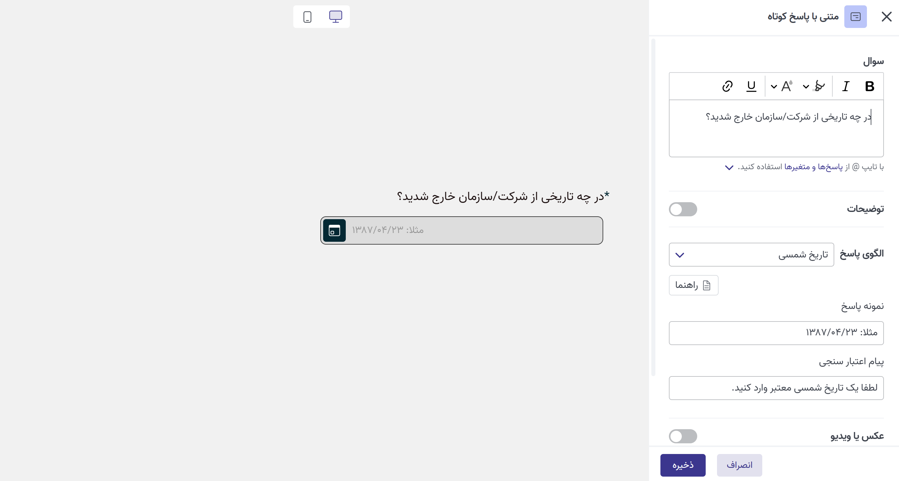 برای بررسی آخرین وضعیت شغلی کارجو، میتوانید از چند سوال «متنی با پاسخ کوتاه» همراه با الگوی مناسب استفاده کنید. برای مثال، جهت دریافت تاریخ شروع و تاریخ پایان همکاری با سازمان قبلی، از الگوی تاریخ شمسی استفاده کنید.