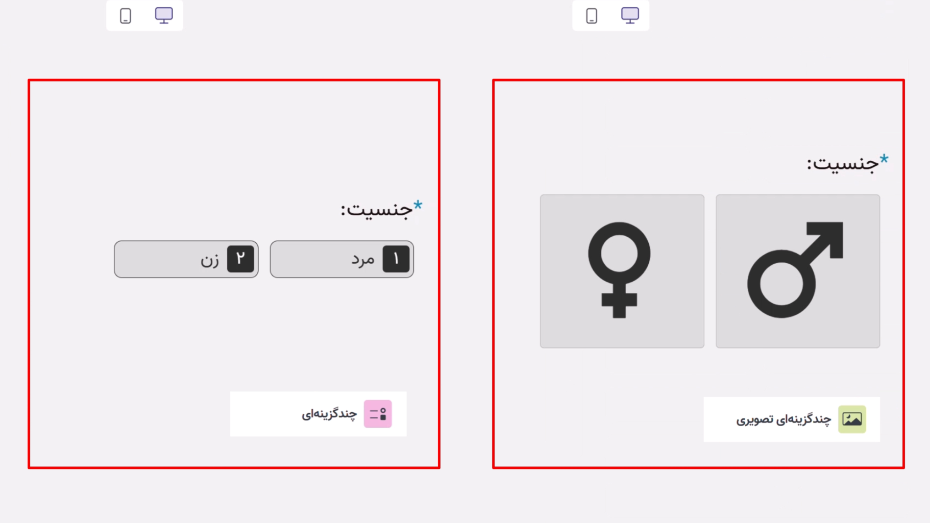 برای دریافت جنسیت و وضعیت تاهل، میتوانید از نوع سوال «چندگزینهای» یا «چندگزینهای تصویری» استفاده کنید.