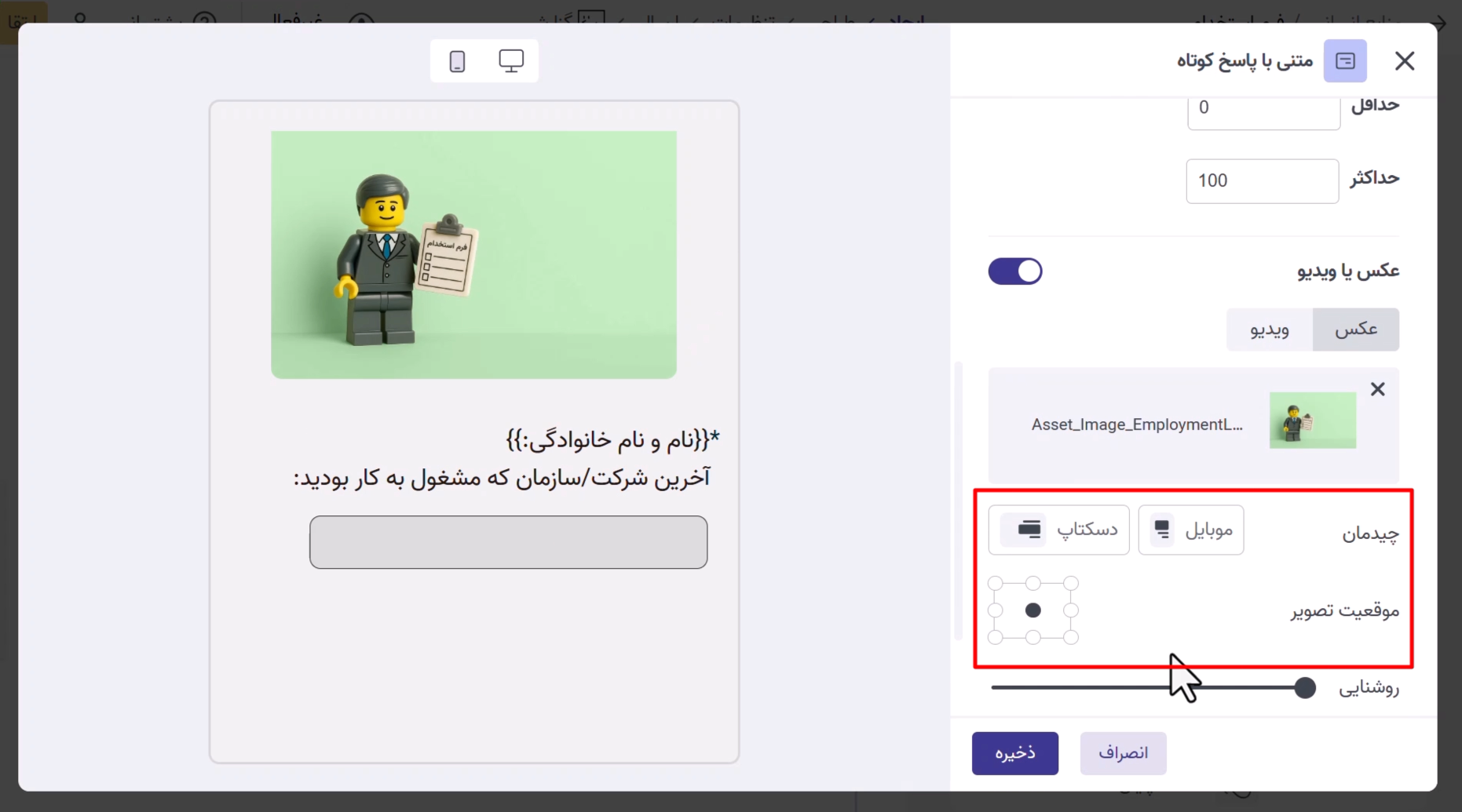 در فاز «طراحی»با رنگبندیهای متنوع، درج لوگو و عکس پسزمینه میتوانید تا آخرین پیکسل فرم را مطابق هویت بصری سازمان خود طراحی کنید . همچنین در هر سوال، میتوانید با فعالکردن عکس/ویدیو و استفاده از ویژگی «چیدمان»، تصویر دلخواه را بارگذاری و موقعیت نمایش آن را بهصورت مجزا در موبایل و دسکتاپ تنظیم کنید.این موارد تجربهی کارجو را حرفهایتر و هماهنگتر با برند شما میسازد.
