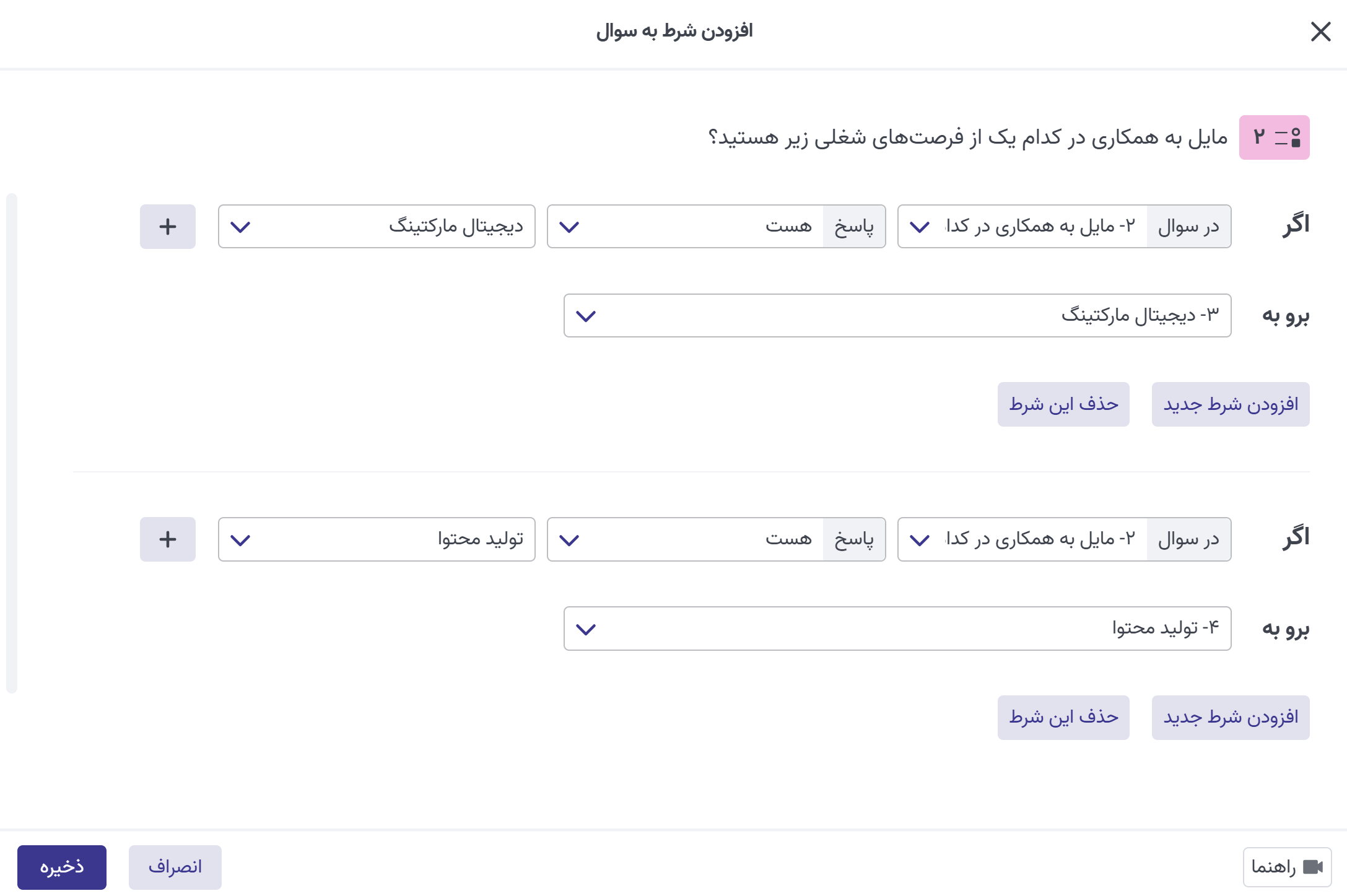 فراموش نکنید اگر فرم استخدامی شما برای چند موقعیت شغلی طراحی شده است، بهتر است در ابتدای فرم، از کارجو بخواهید موقعیت شغلی مورد نظر خود را انتخاب کند. با این روش، میتوانید با استفاده از شرطگذاری، فقط سوالهای مرتبط با همان موقعیت را به او نمایش دهید. این کار نهتنها تجربه پاسخدهی را شخصیسازیشدهتر میکند، بلکه فرآیند جستوجو و گزارشگیری شما را نیز دقیقتر و سریعتر خواهد کرد.