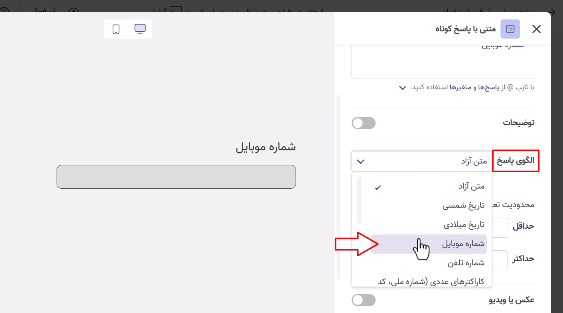 و برای شماره تماس، الگوی «شماره موبایل» را انتخاب کنید. سپس سایر اطلاعات فردی مورد نیاز را هم به همین روش به پرسشنامه اضافه کنید.