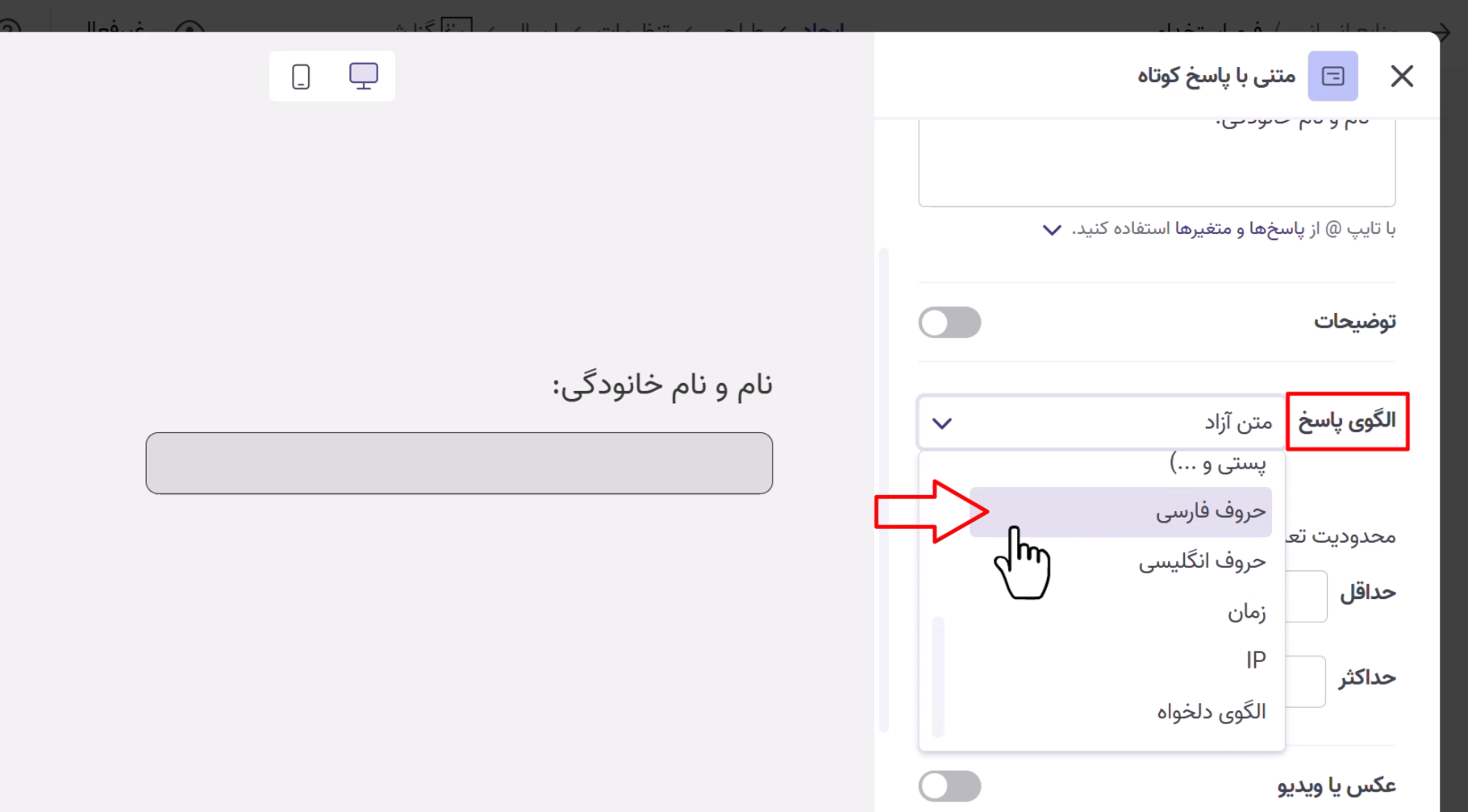 برای دریافت اطلاعات فردی کارجو، از نوع سوال «متنی با پاسخ کوتاه» استفاده کنید و الگوی پاسخ را متناسب با محتوای سوال تنظیم کنید. برای مثال، برای نام و نام خانوادگی الگوی «حروف فارسی»