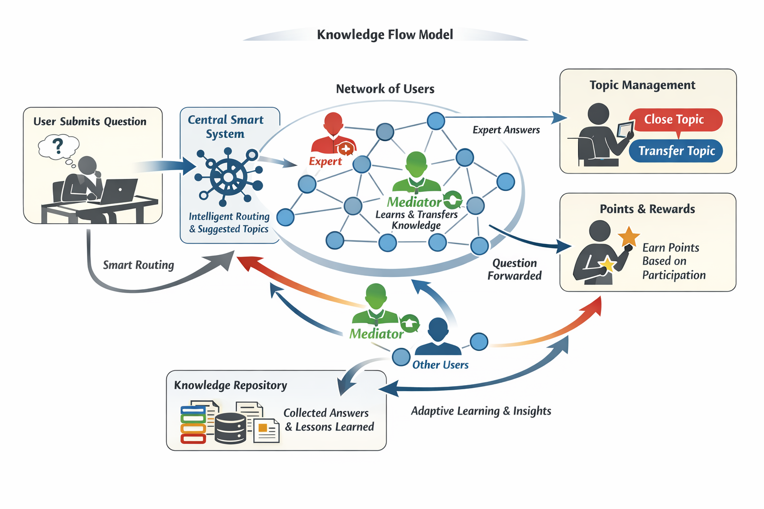 مدل پیشنهادی بر اساس طرح سؤال توسط افراد شبکه آغاز میشود و سیستم مرکزی هوشمند، مسیر انتشار سؤال را بر اساس فاصله شبکهای، حوزه تخصصی، تجربه گذشته و کلیدواژههای مرتبط هدایت میکند. گیرندگان سؤال میتوانند پاسخ دهند یا سؤال را برای افراد مناسب بازانتشار کنند و سؤالکننده کنترل مدیریت تاپیک را بر عهده دارد. هر فرد بر اساس مشارکت خود امتیاز دریافت میکند و پروفایل دانشی افراد به صورت پویا بهروزرسانی میشود تا نقشهای خبره، واسطه و گره مرکزی مشخص شود.