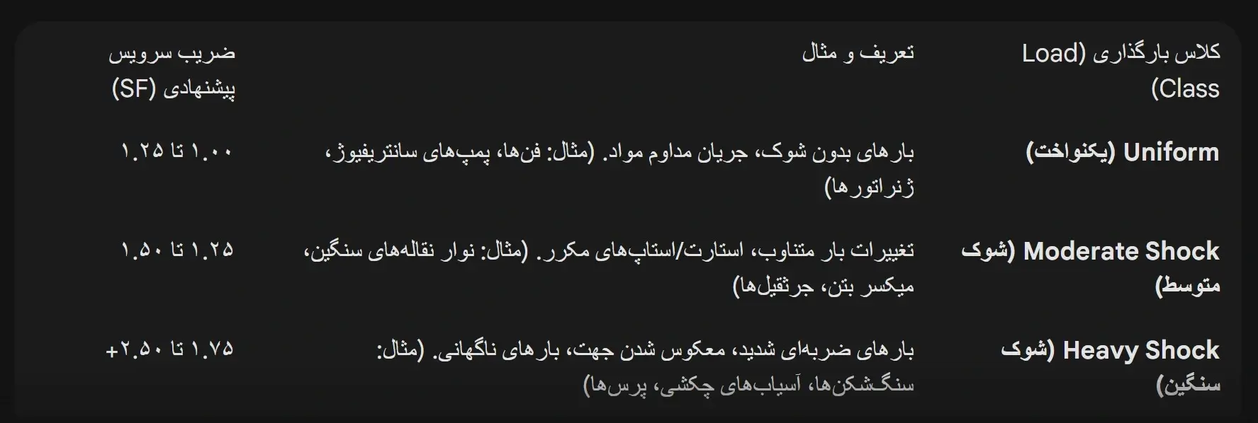 ضریب سرویس، حاشیه ایمنی مهندسی شدهای است که بر اساس شدت بارگذاری و شرایط کاری اعمال میشود. فرمول پایه عبارت است از: