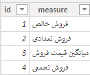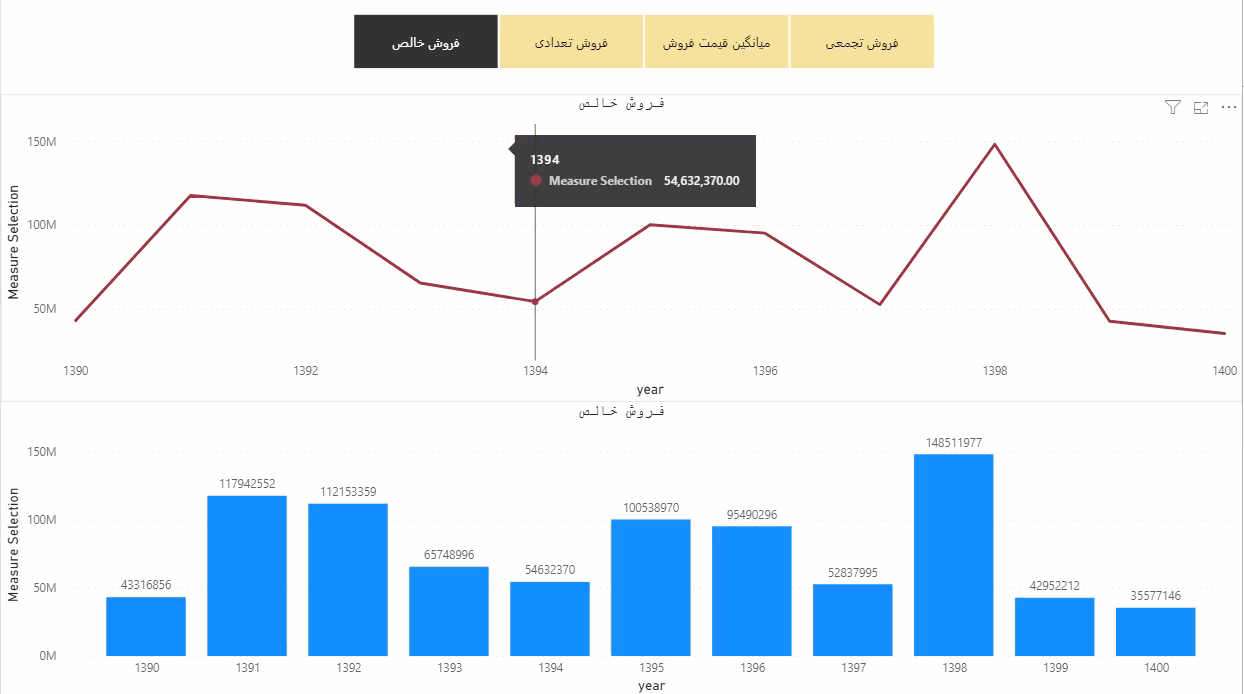 Measure Selection = SWITCH ( SELECTEDVALUE (MeasureTable[measure]), "فروش خالص", Data[total sales], "فروش تعدادی", Data[total sales in qty], "میانگین قیمت فروش", Data[avg sales in qty], "فروش تجمعی", Data[year running total in total sale] )