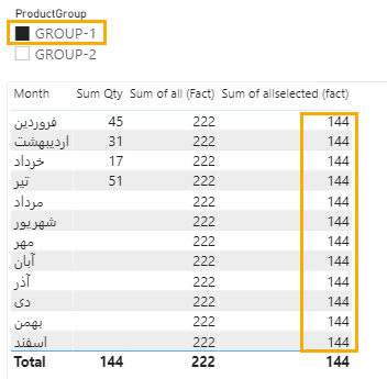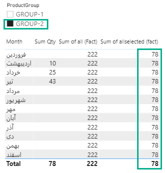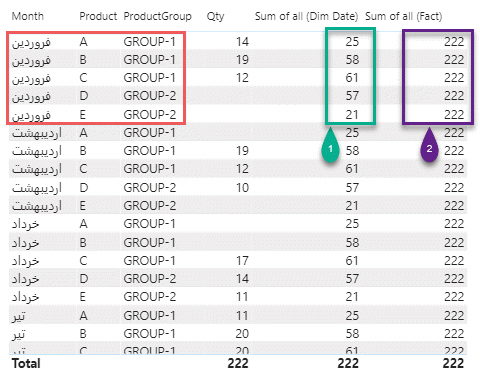شماره یک؛ در measure اول با نام Sum of all (Dim Date)، با توجه به داده هایی که در دو جدول داریم مجموع تعدادی مقادیر رو با حذف فیلترهای جدول DimDate محاسبه می کند. در خروجی این فرمول، مقادیر ستون Qty بدون اعمال فیلتر ستون Month جمع خواهند شد. به همین دلیل است که در تصویر بالا این مقدار برای همه ماه ها تکرار شده است و به طور مثال مقدار ۵۸ محصول B مقدار مجموع Qty همه ماه ها می باشد در صورتی که مقدار فروردین ماه آن ۱۹ می باشد. در نتیجه با اعمال ALL بر روی DimDate از اعمال فیلتر ماه بر روی محاسبات صرف نظر می شود.