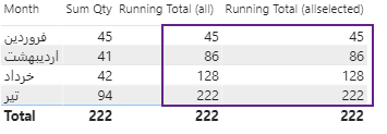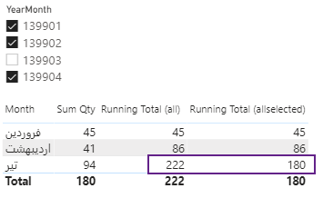 در صورت استفاده از فیلتر بر روی جدول، تابع ALL با توجه به این که در محاسبات تمام فیلترها اعلامی رو حذف می کند در نتیجه انتخاب ماه هیچ تفاوتی در نتیجه ایجاد نمی کند. به عبارت دیگر در مثال بالا با عدم انتخاب ماه خرداد (۱۳۹۹۰۳) جمع تجمعی در فرمول حاوی ALLSELECTED بین مقادیر انتخاب شده صورت می گیرد و مقدار خرداد ماه در نظر گرفته نمی شود ولی در صورتی که در فرمول حاوی ALL به خاطر حذف شدن همه فیلترهای جدول fact، اعمال فیلتر تاثیری بر محاسبات ندارد.