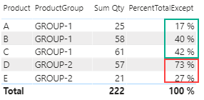 PercentTotalExcept = SUM ( 'fact'[Qty] ) / CALCULATE ( SUM ( 'fact'[Qty] ), ALLEXCEPT ( 'fact', 'fact'[ProductGroup] ) )