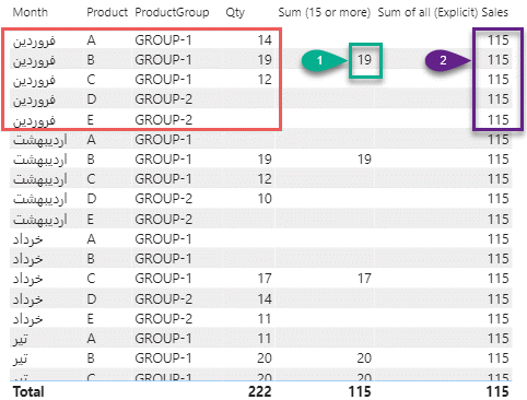 در فرمول اول، تمام مقادیر بزرگتر از ۱۵ رو جمع زدیم که به طور مثال برای فروردین ماه مقدار ۱۹ خواهد شد (شماره ۱) و در فرمول دوم با توجه به محاسبات فرمول اول یعنی استفاده از measure اول در فرمول دوم و اعمال فیلتر ALL بر روی fact خواهیم دید که فیلتر مقادیر بزرگتر از ۱۵ (explicit) در این فرمول اعمال میشه و فیلترهای implicit که در مثال قبل آوریم از محاسبات حذف می شوند. در نتیجه مقدار ۱۱۵ در این محاسبات مجموع کل ستون Qty بدون در نظر گرفتن نوع کالا و گروه کالا و ماه می باشد ولی تنها مقادیر بزرگتر از ۱۵ در این ستون جمع شده اند.