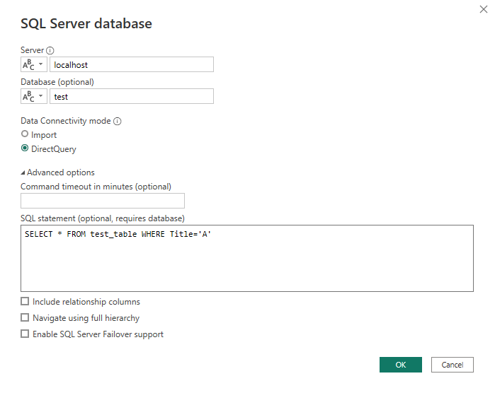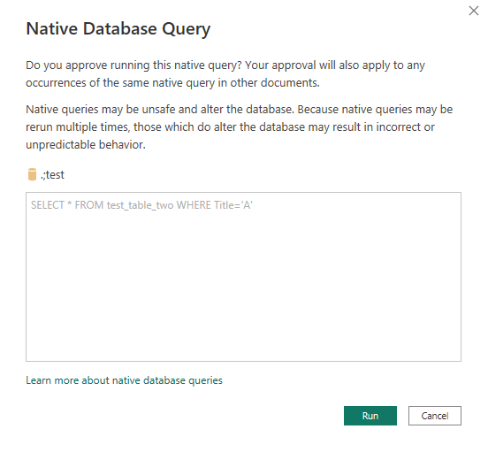 let Source = Sql.Database("localhost", "test", [Query="SELECT * FROM test_table WHERE Title='A'", CreateNavigationProperties=false]) in Source