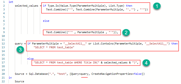 let selected_values = if Type.Is(Value.Type(ParameterMultiple), List.Type) then Text.Combine({"'", Text.Combine(ParameterMultiple, "','") , "'"}) else Text.Combine({"'" , ParameterMultiple , "'"}), query = if ParameterMultiple = "__SelectAll__" or List.Contains(ParameterMultiple, "__SelectAll__") then "SELECT * FROM test_table" else "SELECT * FROM test_table WHERE Title IN(" & selected_values & ")", Source = Sql.Database(".", "test", [Query=query, CreateNavigationProperties=false]) in Source
