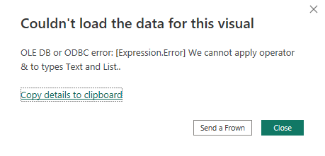 اما نکته دوم این که در مثال اول فقط یک مقدار به عنوان پارامتر قابل پاس دادن است. اگر مجموعه از مقادیر رو انتخاب کنید با خطا رو به رو می شوید. این خطا نشان می دهد که امکان استفاده از عملگر & رو در عبارت M ندارید. یعنی لیست رو نمی تونیم به صورت متن به کوئری پیوست کنیم.