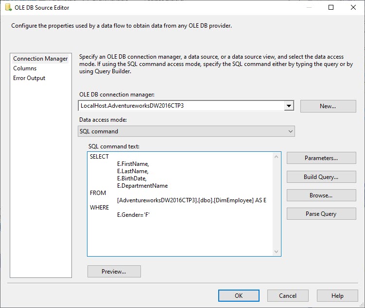 3- به قسمت Data Flow برید و برای گرفتن داده از دیتابیس (MS SQL Server)، OLE DB Source را ایجاد کنید و دابل کلیک کنید و سپس پس از ایجاد یک کانکشن یا استفاده از کانکشن موجودتون، کوئری یا نام جدول مورد نظر خود را وارد کنید.
