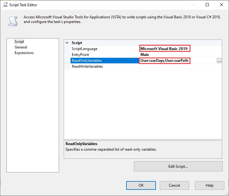 3- به پنجره Script Task وارد شوید و Visual Basic رو انتخاب کنید سپس متغیر ها رو در قسمت ReadOnly وارد کنید و در نهایت Edit Script رو انتخاب کنید.