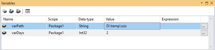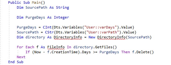 Dim SourcePath As String Dim PurgeDays As Integer PurgeDays = CInt(Dts.Variables("User::varDays").Value) SourcePath = CStr(Dts.Variables("User::varPath").Value) Dim directory As DirectoryInfo = New DirectoryInfo(SourcePath) For Each f As FileInfo In directory.GetFiles() If (Now - f.CreationTime).Days >= PurgeDays Then f.Delete() Next