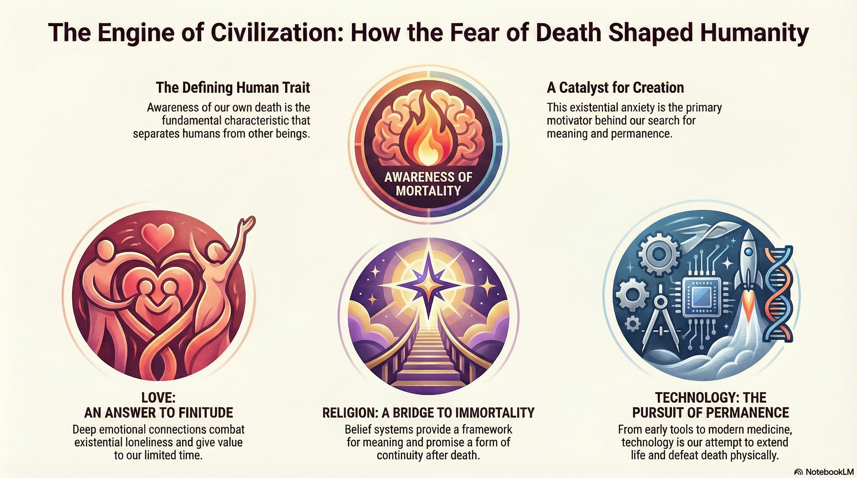 انسان، این موجود کنجکاو و خلاق، از دل ترس عمیق خود از مرگ، زیباترین و پیچیدهترین جنبههای تمدن را آفریده است. عشق، به عنوان پلی میان تنهایی وجودی و اتصال انسانی؛ خدا و مذهب، به عنوان وعدهای برای معنا و جاودانگی؛ و تکنولوژی، به عنوان ابزاری برای گسترش مرزهای زندگی، همگی ریشه در همان آگاهی اولیه از فناپذیری دارند. این سه عنصر، نه جدا از هم، بلکه در تعاملی پیچیده و دائمی، شکلدهنده تجربه انسانی هستند.