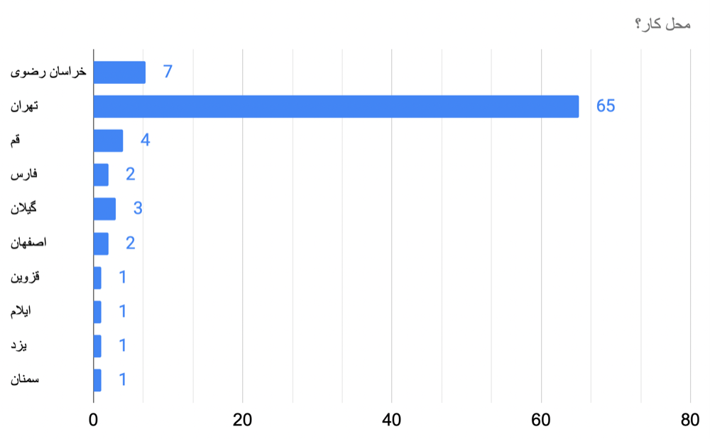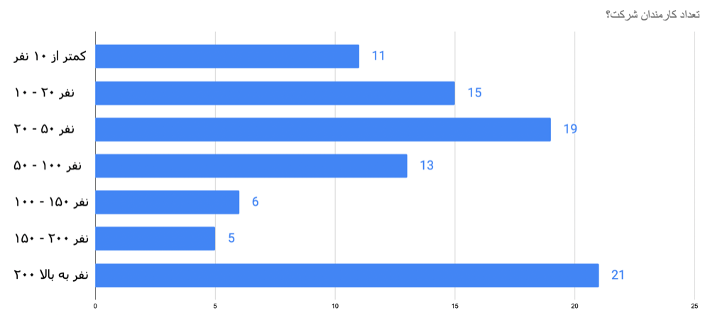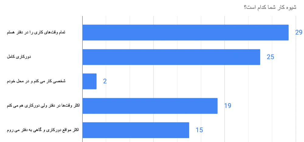 از بین پرسشنامه ها ۲ نفر بصورت کامل شخصی و روی پروژه ها خودشون کار میکنن و تنها ۲۹ نفر از توسعه دهنده ها بصورت تمام وقت شرکت هستن و سایر بصورت دورکاری کامل و یا هیریدی مشغول به فعالیت هستن که پیدا شدن کرونا بی تاثیر به این قضیه نبوده.
