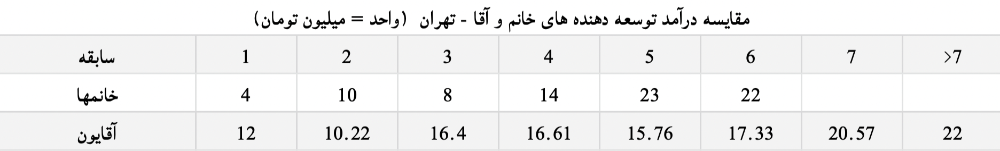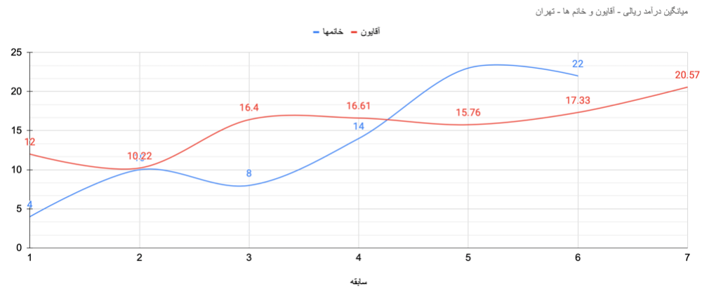 که باتوجه به دادها های جمع آوری شده فوق میتونیم نمودار مقایسه ای میانگین درآمد ریالی خانمها و آقایون در تهران رو مشاهده بکنیم.