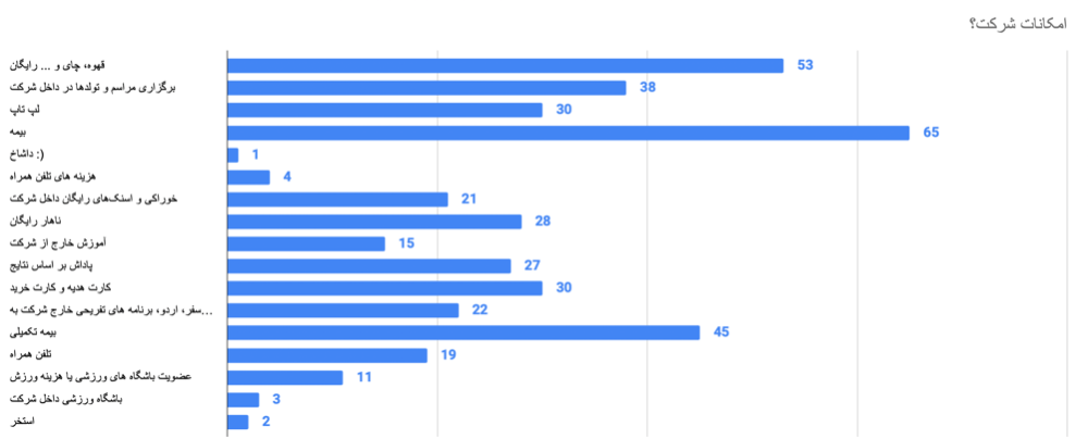 و امکاناتی که شرکت ها به کارمنداشون اختصاص دادن بیشتر شامل بیمه، نوشیدنی رایگان، بیمه تکمیلی، برگزاری مراسم ها و تلود ها و لپتاپ هستش و البته یکی از دوستان بخاطر اینکه خیلی از شرکتشون راضی نبوده و هیچ امکاناتی براشون نذاشته یخورده عصبانی بودن و البته ما هم بدون سانسور نظرش رو گذاشتیم :)))