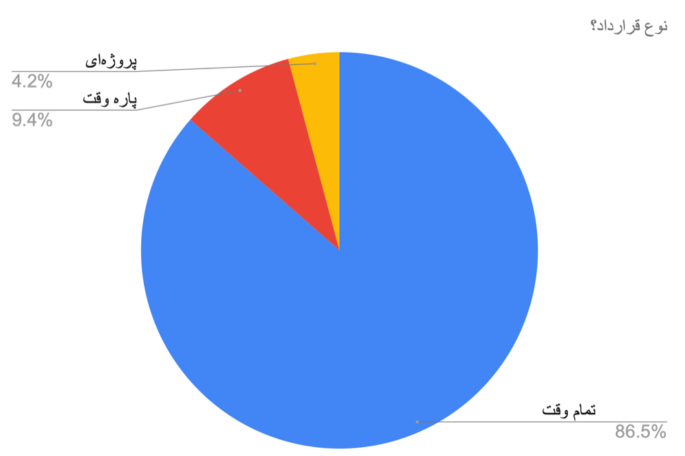 واما نوع قرارداد ها که بیشترین وضعیت قرارداد ها رو نوع قرارداد تمام وقت به خودش اختصاص داده و ظاهرا طبق داده ها شرکت ها تمایل خیلی زیادی به قراردادهای پاره وقت و یا یا پروژه ای ندارن.