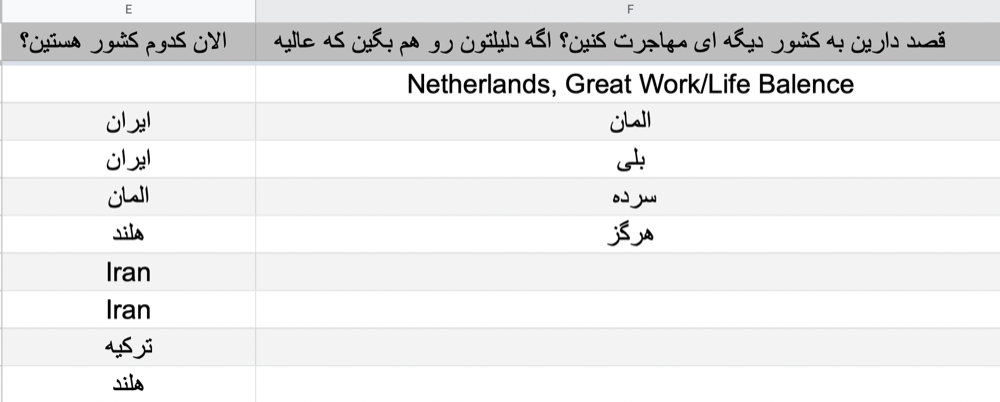 یکی از سوالا این بود که الان کدوم کشور هستی و آیا قصد داری برای سال آینده به کشور دیگه ای مهاجرت کنی یا نه؟