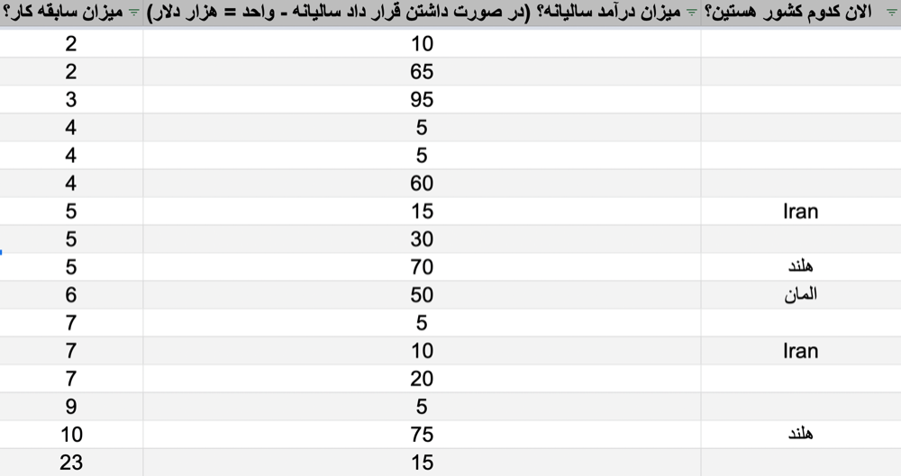 طبق پیش بینی که شد میزان دیتاهایی که برای درآمد ارزی داشتیم متاسفانه کم بود و یک سری از داده ها به مقداری کم بودن که حدس میزنم توسعه دهنده سهوا بجای درآمد سالیانه مقدار درآمد ماهیانه ش رو نوشته اما طبق چیزی که خودم بصورت شفایی از دوستانی که خارج از ایران هستن پرسیدم حدود رنج درآمدی بسته به کشوری که توش هستن چیزی بین ۵۰ تا ۸۰ هزار دلار بصورت سالیانه هستش.