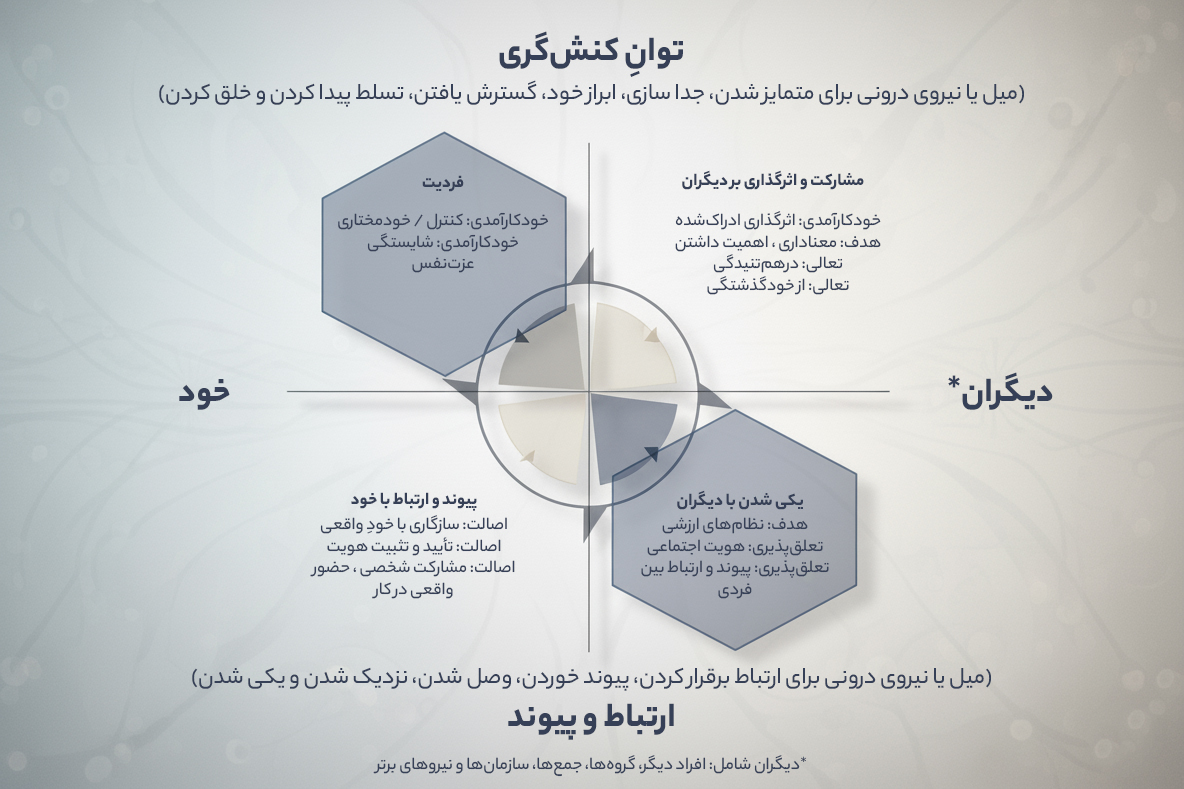 تعلق (Belongingness): اینکه در کار، تنها نیستیم؛ عضو چیزی بزرگتر از خودمان هستیم و با دیگران «سرنوشت مشترک» داریم.