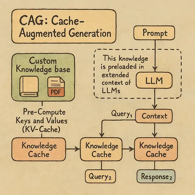 چیه این CAG؟ حالا فکر کن به جای اینکه موقع امتحان برگه بدی، کل کتاب درسی رو قبلش به LLM بدی و بذاری بخونتش (دانش رو پیشبارگذاری کنه) تو حافظه کوتاهمدتش (context window). CAG میخواد از context windowهای بزرگتر LLMهای جدید مثل Gemini استفاده کنه.