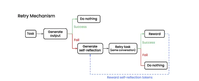 پاداشدهی با GRPO: اگر تلاش مجدد موفقیتآمیز باشد، تنها توکنهایی (واژهها یا اجزای کلام) که در فرآیند بازاندیشی (مرحله ۳) تولید شدهاند، سیگنال پاداش مثبت دریافت میکنند.