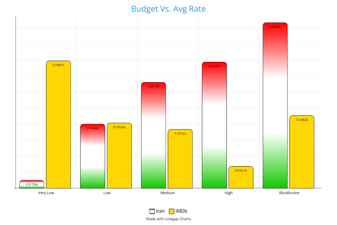 در وبسایت IMDb، که منبع اطلاعات این پروژه بوده است، هزینهی ساخت فیلمها بر اساس واحد پولی کشور سازندهی آنها گزارش شده است. برای مثال، بودجهی فیلمهای تولیدشده در هند به روپیه ثبت شده است. بهمنظور مقایسهی هزینههای ساخت، لازم بود تمامی این مقادیر به یک واحد پولی یکسان تبدیل شوند. ازاینرو، بودجهها به دلار تبدیل شدهاند تا امکان مقایسهی دقیق آنها فراهم شود. پس از این مرحله، فیلمها بر اساس هزینهی ساختشان به پنج دسته (Bin) تقسیم شده و میانگین امتیازات وزندار هر گروه، بر اساس نظر هر دو دسته از کاربران، محاسبه گردید.