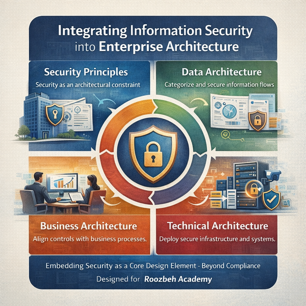 وقتی از «ادغام الزامات امنیت اطلاعات در معماری سازمانی» صحبت میکنیم، منظور افزودن چند کنترل فنی به انتهای پروژه نیست؛ منظور تغییر پارادایم طراحی است. در این رویکرد، امنیت نه یک لایه تزئینی یا واکنشی، بلکه بخشی از منطق معماری، جریان داده، طراحی فرآیند و حتی مدل حاکمیتی سازمان است. در ادبیات حرفهای مدیریت ریسک سازمانی مانند NIST Special Publication 800-39 و همچنین در چارچوبهای معماری سازمانی، امنیت باید در سطح معماری مفهومی، منطقی و فیزیکی جاری باشد.