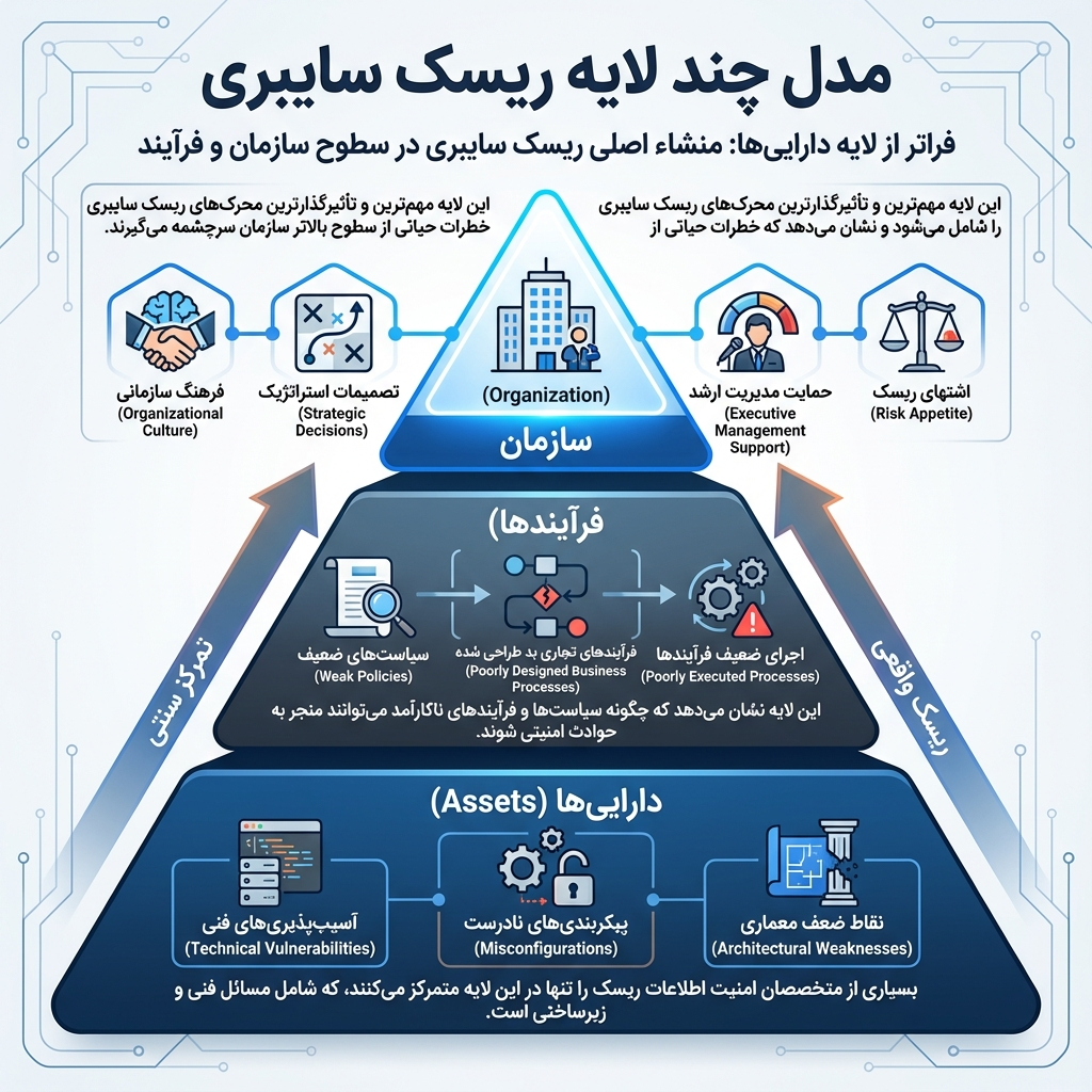 در ادبیات حرفهای امنیت اطلاعات، یکی از بنیادیترین چالشها، برداشت محدود و تقلیلیافته از مفهوم «ریسک» است. در عمل، بخش قابل توجهی از متخصصان امنیت، ریسک سایبری را در سطح داراییها تحلیل میکنند و آن را معادل آسیبپذیریهای فنی، خطاهای پیکربندی، نبود وصلههای امنیتی یا ضعفهای معماری سیستمها میدانند. این درک، اگرچه ضروری و اجتنابناپذیر است، اما تنها بخشی کوچک از تصویر کلی ریسک را نمایان میکند و ناتوان از توضیح ریشه بسیاری از رخدادهای بزرگ امنیتی در سازمانهای مدرن است. چارچوبهای مدیریتی و حرفهای مانند CISM، ISSMP، COBIT و مدلهای مدیریت ریسک سازمانی نشان میدهند که ریسک سایبری مفهومی چندلایه است که در سه سطح اصلی، یعنی دارایی، فرآیند و سازمان شکل میگیرد و صرف تمرکز بر لایه فنی، عملاً منجر به نادیدهگرفتن علل اصلی شکستهای امنیتی میشود.