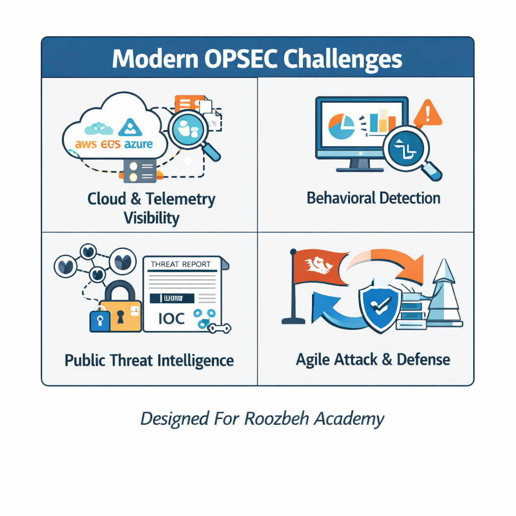 چالشهای مدرن OPSEC حاصل سه تحول اساسی هستند: Visibility گسترده، تحلیل رفتاری پیشرفته، و شفافیت اطلاعاتی عمومی. در چنین محیطی، تیم قرمز باید از مخفیسازی فنی به مدیریت رفتار و زمینه مهاجمانه گذار کند. تیم آبی نیز باید بین شفافیت و حفاظت از قابلیتهای دفاعی تعادل برقرار کند.