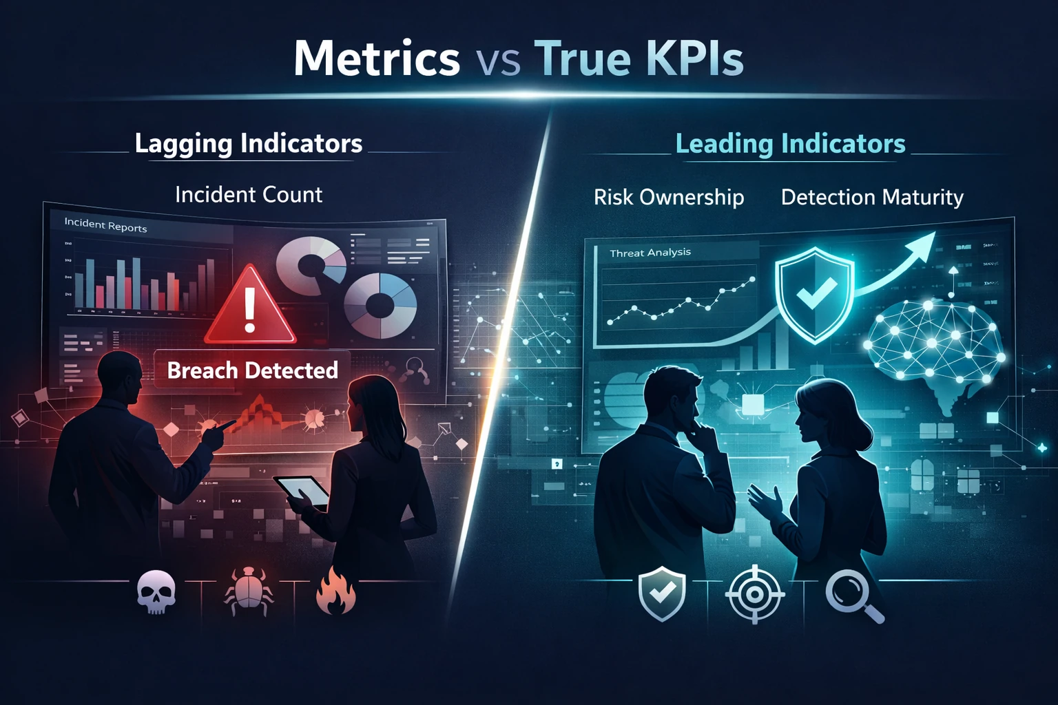 در مقابل، KPIهای پیشبینیکننده سعی میکنند احتمال موفقیت تهدید را قبل از وقوع Incident نشان دهند. مثالهای حرفهایتر عبارتند از :درصد داراییهایی که مالک ریسک مشخص ندارند،میانگین زمان شناسایی drift ،معماری نسبت به baseline،درصد کنترلهای امنیتی که بدون سناریوی تهدید معتبر پیادهسازی شدهاند،نسبت Detection Coverage به Attack Surface واقعی (نه اسمی)