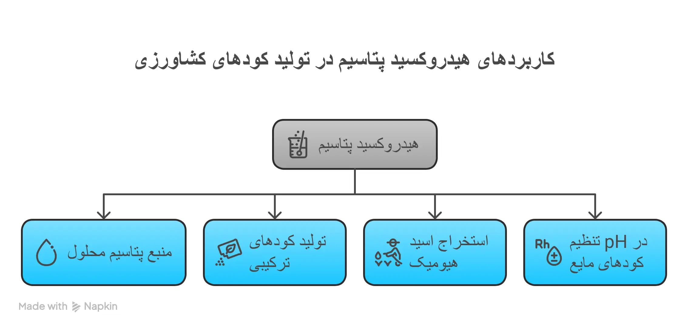 KOH به دلیل خاصیت قلیایی خود، در تنظیم pH محلولهای کود مایع نیز بهکار میرود. این موضوع در پایدارسازی کودهای ترکیبی و افزایش جذب عناصر ریزمغذی اهمیت دارد.