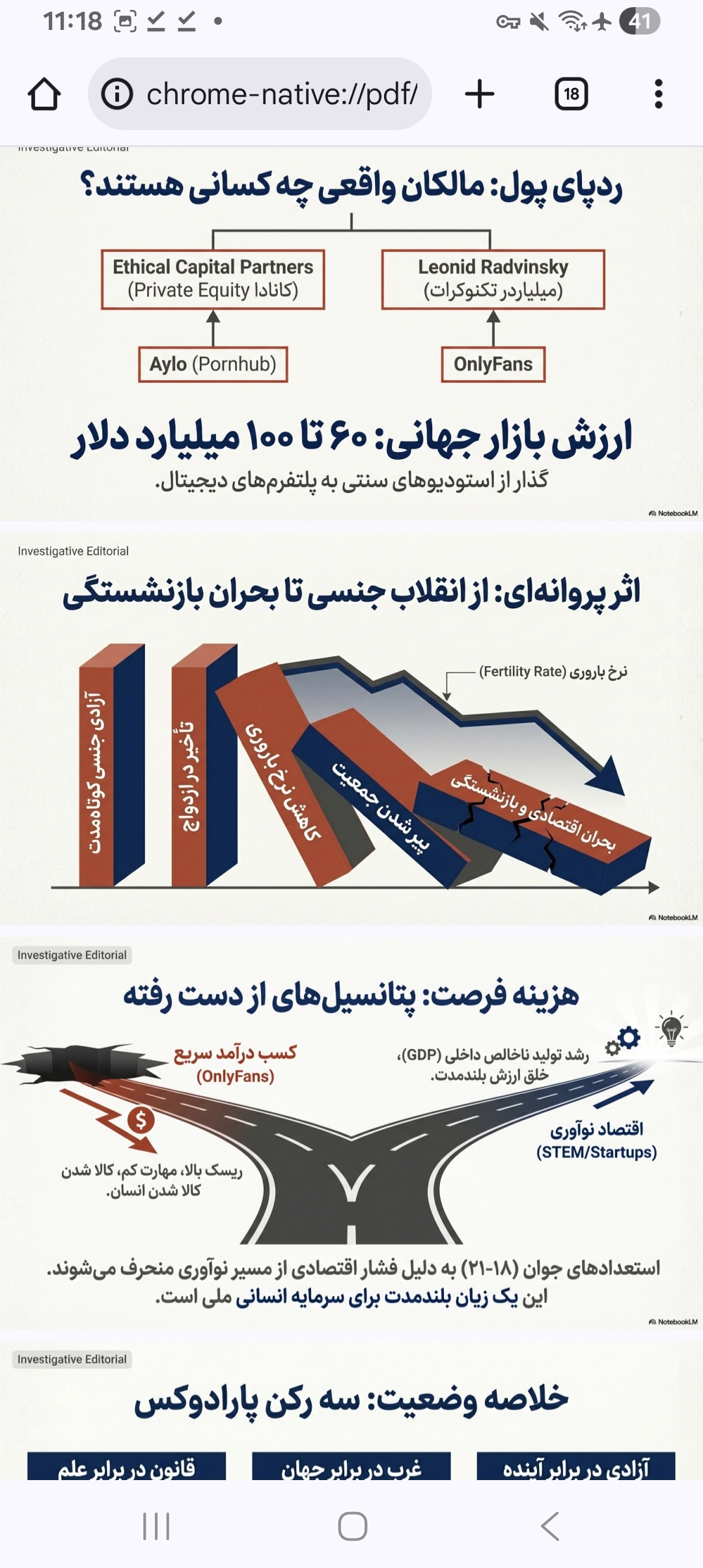 در حالی که سود این صنعت در سال ۲۰۲۶ به ارقامی بین ۷۸ تا ۱۱۲ میلیارد دلار میرسد، ما با یک "اتلاف انرژی اجتماعی" عظیم روبرو هستیم. پتانسیل انسانی که باید صرف نوآوری در اقتصاد دیجیتال و استارتآپهای ۱.۸ تریلیون دلاری شود، در چرخه مصرفگرایی جنسی بلعیده میشود. جامعهای که انرژی خلاق جوانانش را به جای تولید ثبات، به سمت "لذت آنی" هدایت میکند، در حال مصرف کردن سرمایههای آینده خود برای ترازهای مالی کوتاه مدت است.