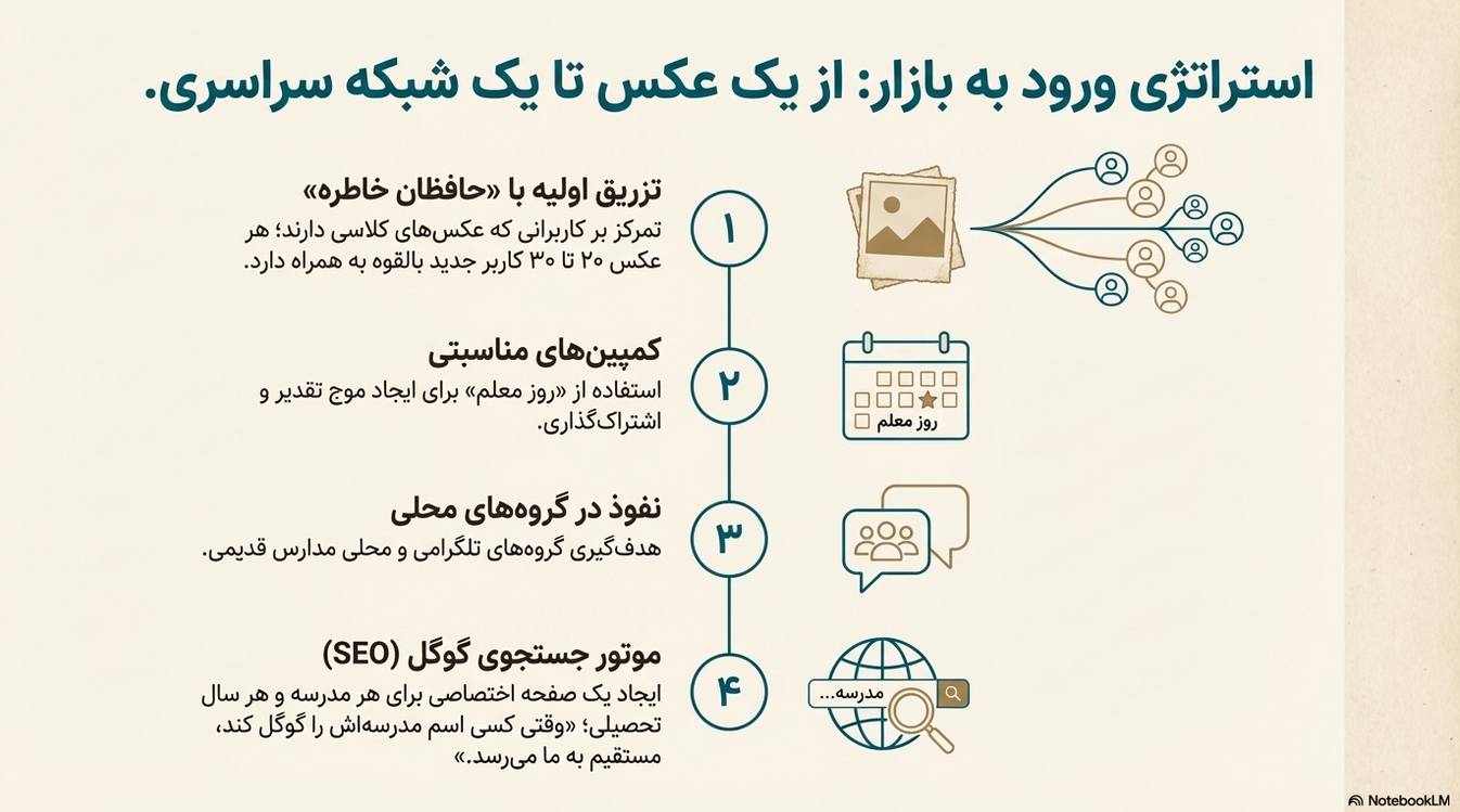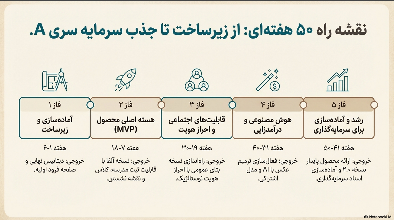 این مجموعه اسناد طرحی جامع و چندوجهی برای توسعه یک شبکه اجتماعی نوستالژیک متمرکز بر مدرسه به نام «همکلاسیتو» (HamClassi) را تشریح میکند. هدف اصلی این پلتفرم احیای خاطرات و هویت دیجیتال دوران مدرسه، پیدا کردن همکلاسیهای قدیمی و معلمها، و حفظ عکسهای در حال تخریب دهههای گذشته است. برای عملیاتی شدن این ایده، منابع یک اسکیمای دیتابیس PostgreSQL کامل، شامل جداول Students, Classes و Memories، و همچنین ساختار فنی برای جستجوی تماممتن (Full-text Search) را ارائه میدهند. نکته کلیدی طرح، استفاده از مکانیزم خلاقانه «احراز هویت نوستالژیک» است که بر پایه سؤال و جوابهای مشترک و تأیید اجتماعی (Peer Verification) توسط حداقل سه همکلاسی بنا شده است. علاوه بر این، یک نقشه راه اجرایی ۵۰ هفتهای، ساختار Pitch Deck برای جذب سرمایهگذار، و یک مدل مالی دقیق که سناریوهای رشد، هزینههای جذب مشتری (CAC) و ارزش طول عمر کاربر (LTV) را محاسبه میکند، برای پیشبرد پروژه تدوین شده است. در نهایت، این طرح تأکید ویژهای بر مزیتهای رقابتی مانند ترمیم عکسها با هوش مصنوعی و تمرکز بر طراحی UX شبیه به دفتر یادگاری قدیمی دارد.