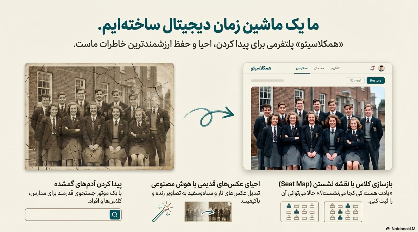 ایده همکلاسیتو ترکیبی از Ancestry + Facebook + Google Photos + LinkedIn با تمرکز بر هویت مدرسهای ایرانی است.
