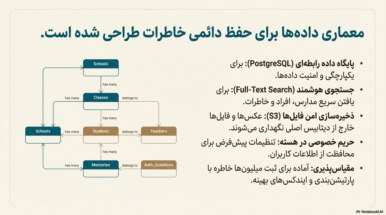 خاطرات (Memories): خاطرات متنی، صوتی و تصویری که به یک کلاس مشخص متصل میشوند و برای جستجوی متنی از ویژگی tsvector در دیتابیس استفاده میکنند,.