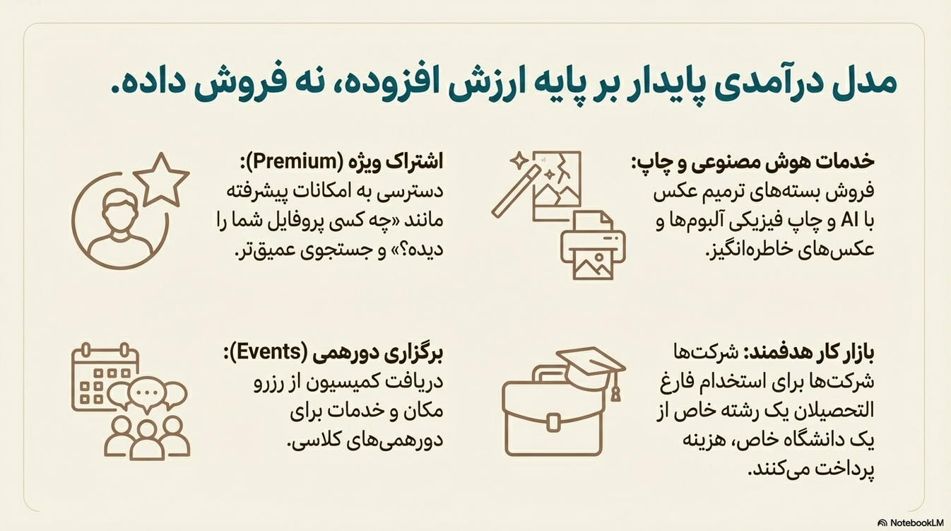 خدمات هدفمند: کمیسیون رویدادها (دورهمی) و فروش دادههای تجمیعی (با رعایت حریم خصوصی),.