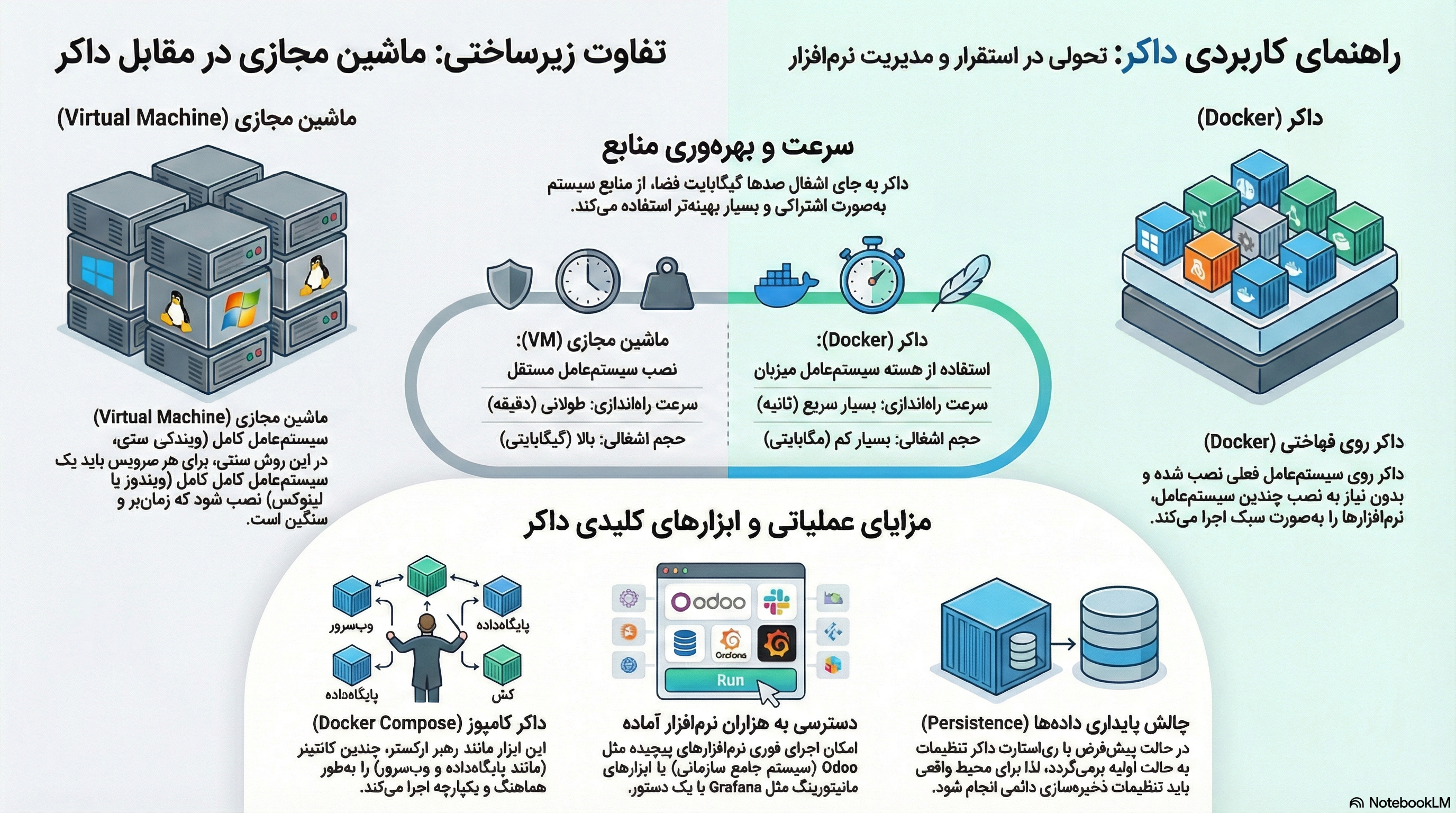 با داکر، یک مدیر فنی یا حتی یک مدیر میانی بدون دانش عمیق از لایه سیستمعامل، میتواند زیرساخت کامل مورد نیاز برای اداره یک شرکت ۱۰۰ نفره را در عرض چند دقیقه بالا بیاورد. چیزی که پیشتر نصب و پیکربندیاش هفتهها زمان میبرد، اکنون در یک کانتینر آماده در اختیار شماست.