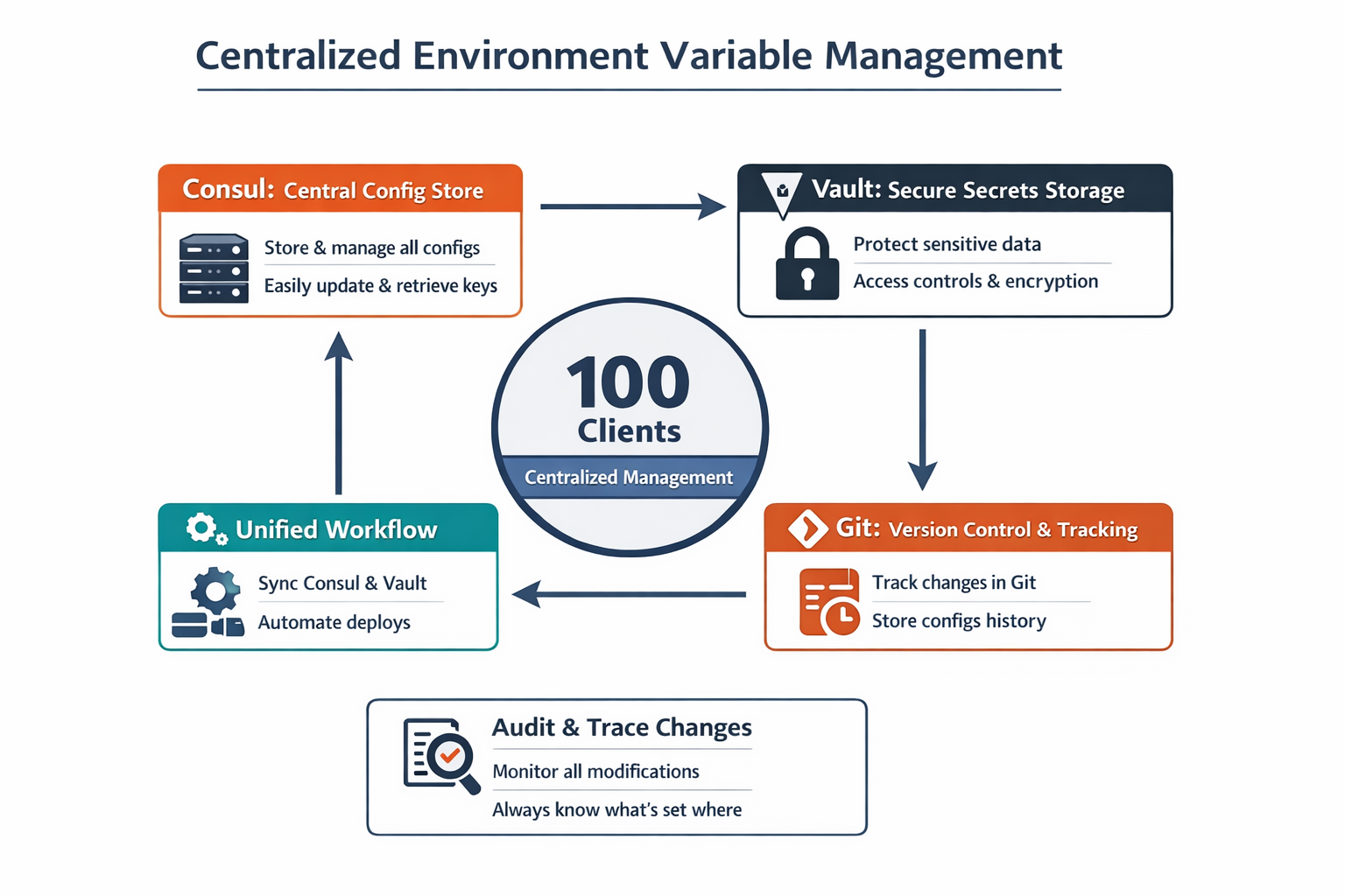 با ترکیب ابزارهایی مثل Consul، Vault و Git، میتوان یک سیستم هوشمند برای مدیریت متغیرهای محیطی طراحی کرد که هم متمرکز، هم امن و هم قابل پیگیری باشد. این سیستم نه تنها به شما کمک میکند که از پیچیدگیهای مدیریت پیکربندیها جلوگیری کنید بلکه بهطور موثر تغییرات را پیگیری کرده و از مشکلات امنیتی جلوگیری میکند.