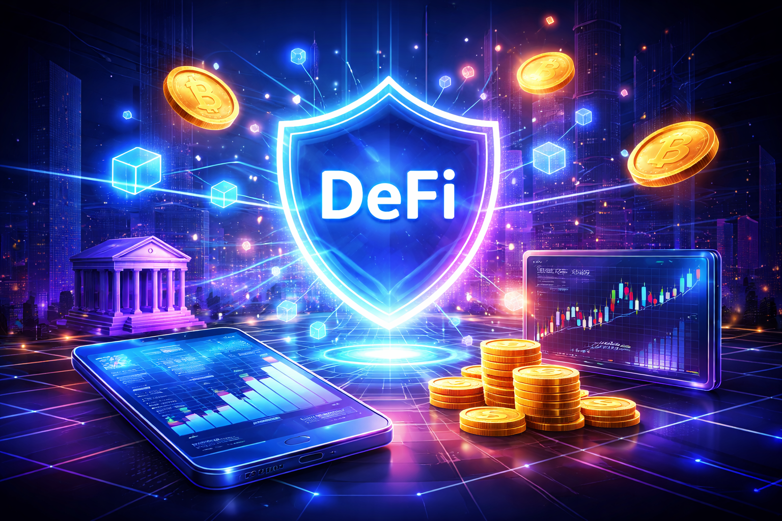 DeFi یعنی انجام کارهای بانکی و مالی (مثل قرض دادن، وام گرفتن، معامله، سرمایهگذاری و …) بدون نیاز به بانک، کارگزاری یا واسطه؛ فقط با کمک بلاکچین و قراردادهای هوشمند.