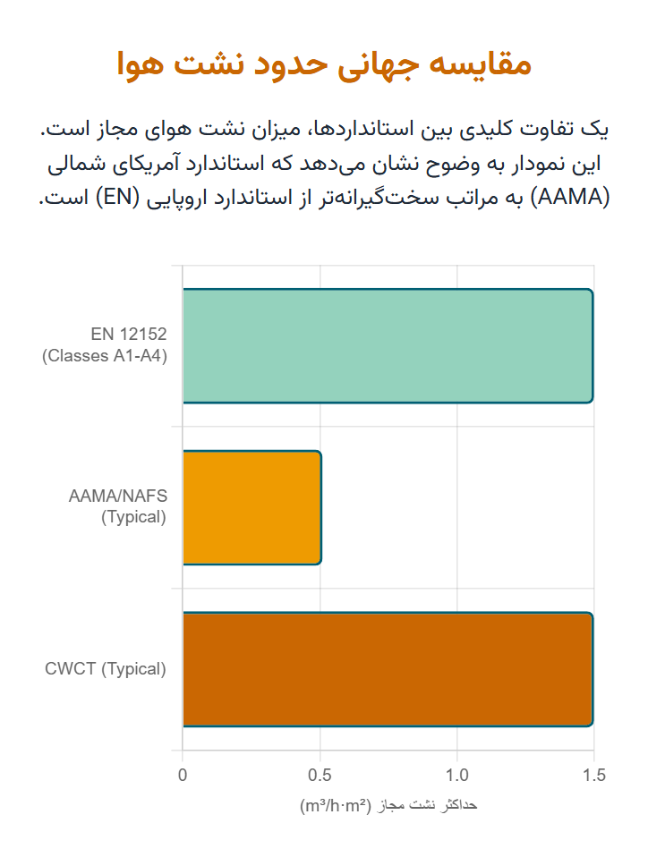 رتبه سازهای بالاتر (AW) ← تغییر شکل کمتر تحت بار ← حفظ فشار درزبندها ← هوابندی برتر در حالت نصبشده. این یک تحلیل عمیقتر است که توضیح میدهد چرا کلاس AW مشخص میشود، حتی اگر مقدار آزمون نشت هوای پایه آن مشابه کلاسهای دیگر به نظر برسد.