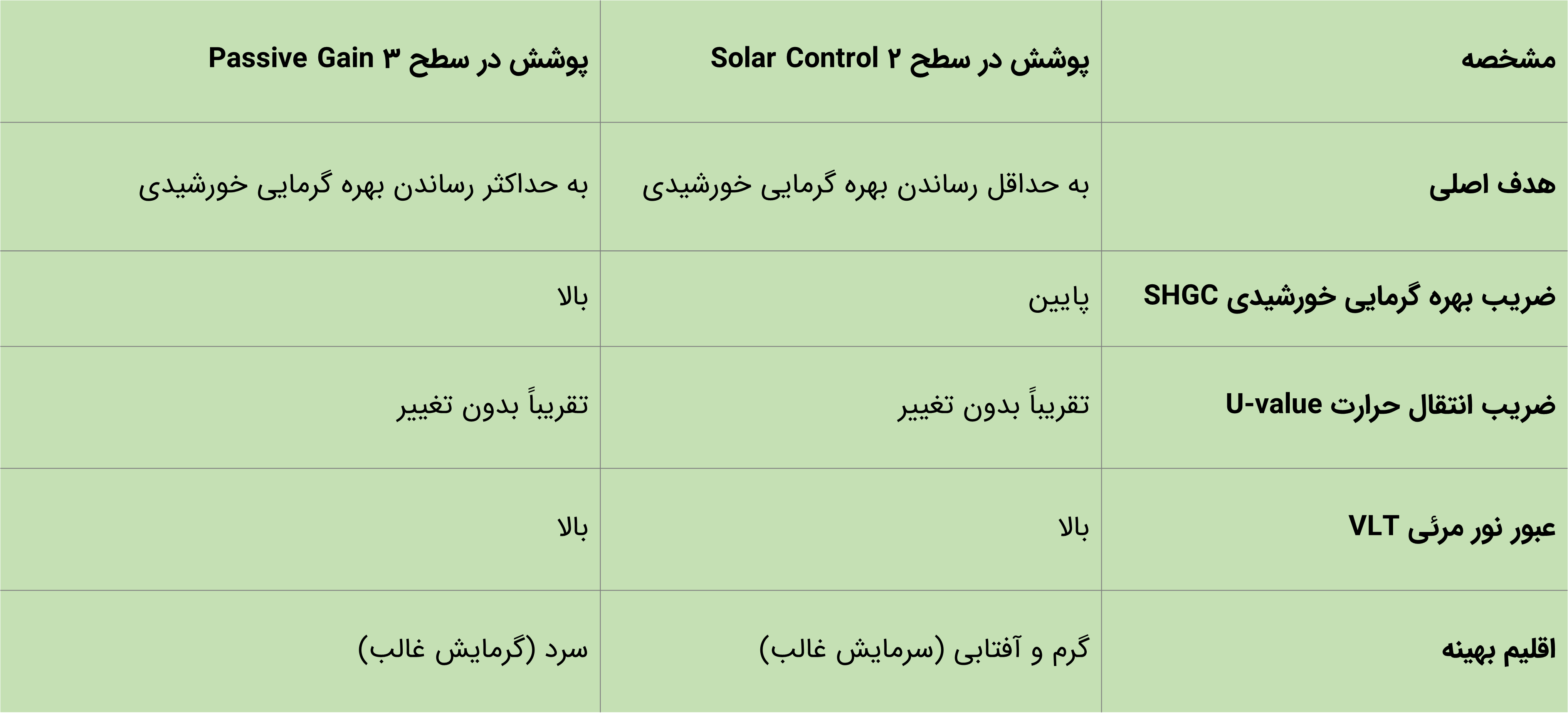 این استراتژی که به آن "کنترل خورشیدی" (Solar Control) میگویند، به طور مؤثری از گرم شدن بیش از حد ساختمان جلوگیری میکند. جدول زیر، این دو استراتژی را به صورت خلاصه مقایسه میکند.