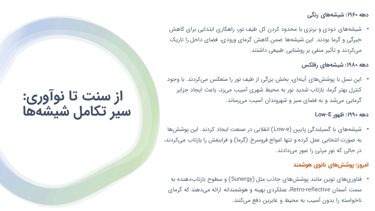 در نهایت، شیشه از یک "پنجره" به جهان، در حال تبدیل شدن به یک "پوسته هوشمند" است که تنفس میکند، واکنش نشان میدهد، انرژی را مدیریت میکند و با محیط پیرامون خود در تعامل است. وظیفه نسل امروز معماران و مهندسان، استفاده آگاهانه از ابزارهای قدرتمندی است که این فناوری در اختیارشان قرار داده تا ساختمانهایی نه تنها زیبا، بلکه پایدار، کارآمد و مسئول در برابر چالشهای بزرگ انرژی و محیط زیست خلق کنند.