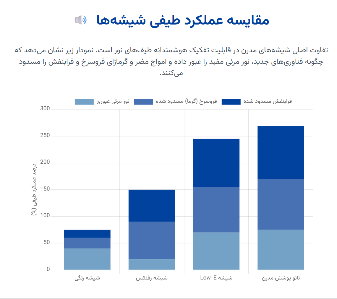 در دوران مدرن، این فناوری با اهداف کاربردیتری احیا شد. شیشههای رنگی (Tinted Glass) مانند انواع برنز و دودی، با افزودن اکسیدهای فلزی به توده مذاب شیشه در فرآیند تولید، بخشی از انرژی خورشیدی را جذب میکنند و از ورود آن به داخل ساختمان میکاهند.10 مکانیسم عملکرد این شیشهها ساده اما غیرهوشمندانه است: آنها کل طیف انرژی خورشید - شامل نور فرابنفش (UV)، نور مرئی (Visible Light) و مادون قرمز (Infrared) - را به صورت غیرانتخابی و یکسان جذب و محدود میکنند.