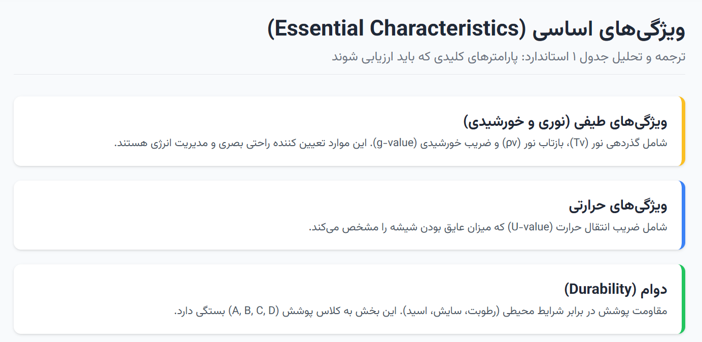 در این گزارش، ساختار استاندارد حفظ شده و هر بند با تفصیل کامل، همراه با جداول دادهها و تحلیلهای مهندسی ارائه میگردد تا به عنوان یک مرجع جامع ۱۵۰۰۰ کلمهای برای متخصصین این حوزه عمل نماید. تغییرات عمده در نسخه ۲۰۱۸ نسبت به نسخه ۲۰۰۴، از جمله کاهش رواداری ضریب گسیل و الزام به درج ضریب خورشیدی (g-value) در اعلامیه عملکرد (DoP)، نشاندهنده حرکت صنعت به سمت دقت بالاتر و شفافیت بیشتر در عملکرد انرژی است.2