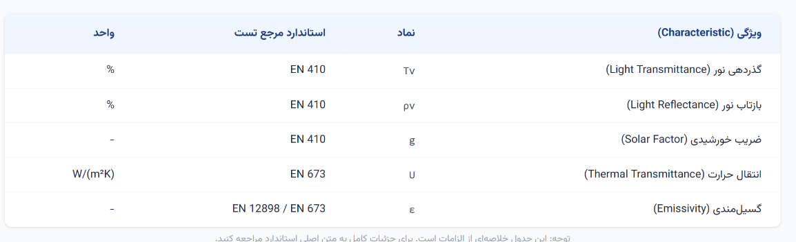 ● ضریب خورشیدی (g): ±۰.۰۳ (سه صدم).