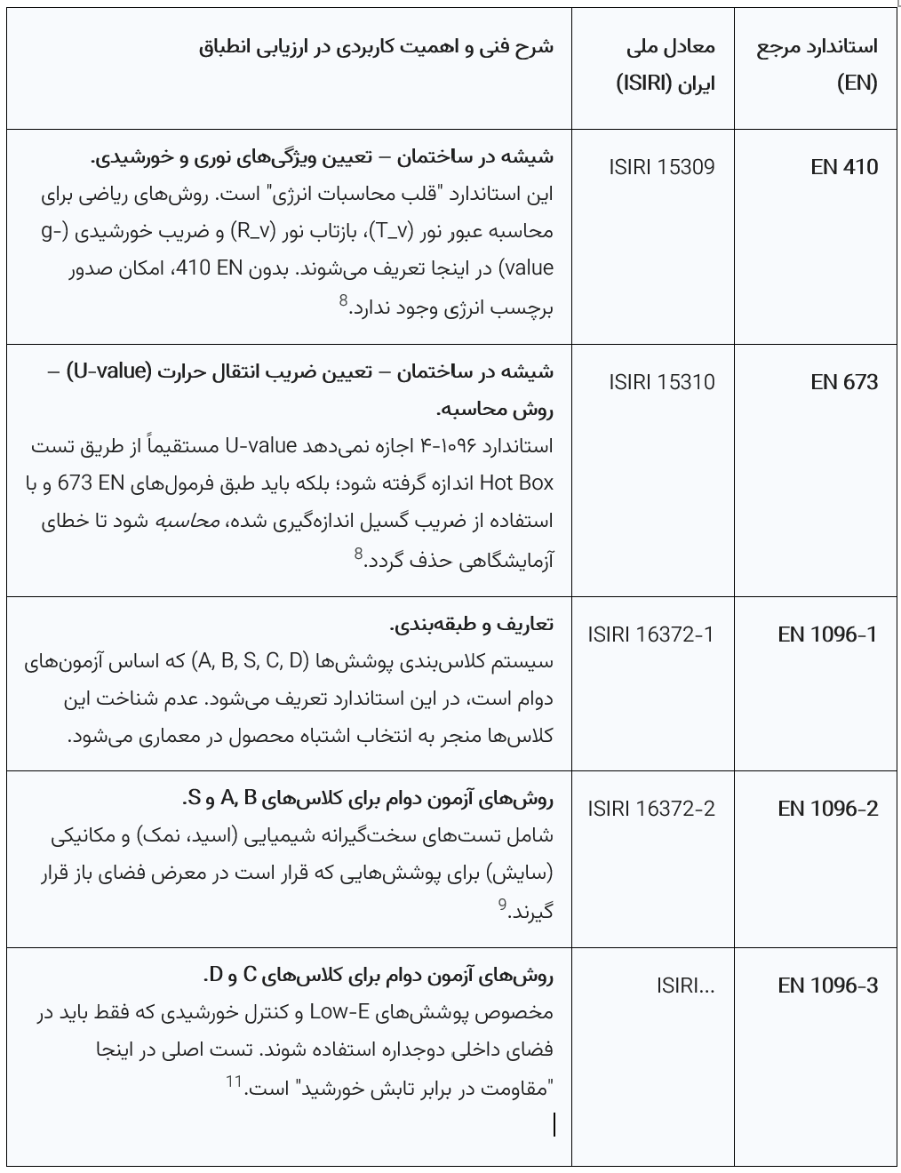 ارتباط این مراجع به صورت زنجیرهای است. برای مثال، برای تایید یک شیشه Low-E طبق EN 1096-4، ابتدا باید زیرلایه آن طبق EN 572-9 تایید شود، سپس ضریب گسیل آن طبق EN 12898 اندازهگیری شود، سپس این عدد در فرمول EN 673 قرار گیرد تا U-value محاسبه شود، و همزمان دوام آن طبق EN 1096-3 تست شود. نقص در هر یک از این حلقهها، منجر به عدم انطباق محصول نهایی با استاندارد ۴-۱۶۳۷۲ ایران خواهد شد.